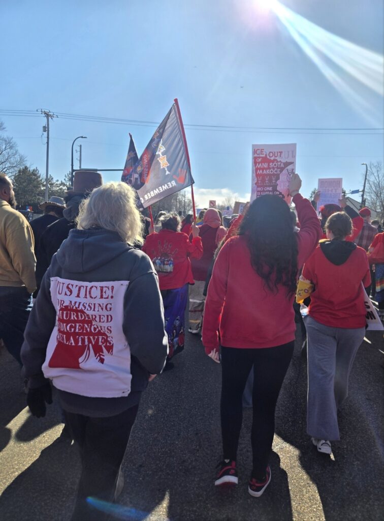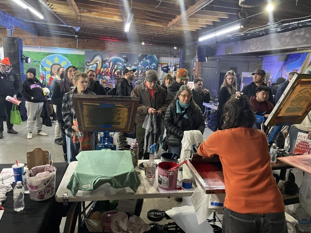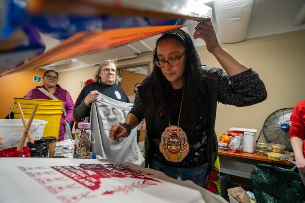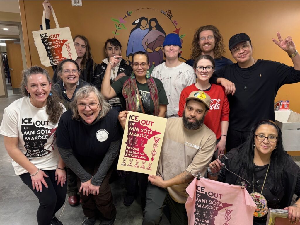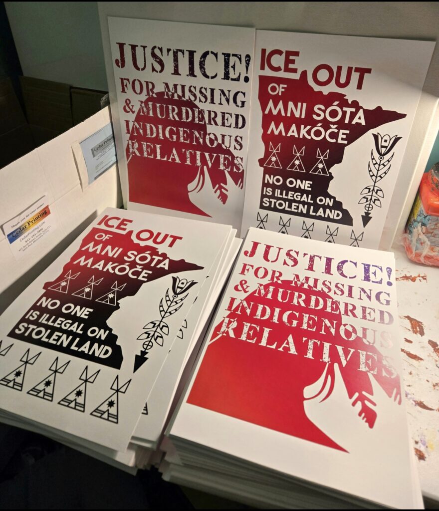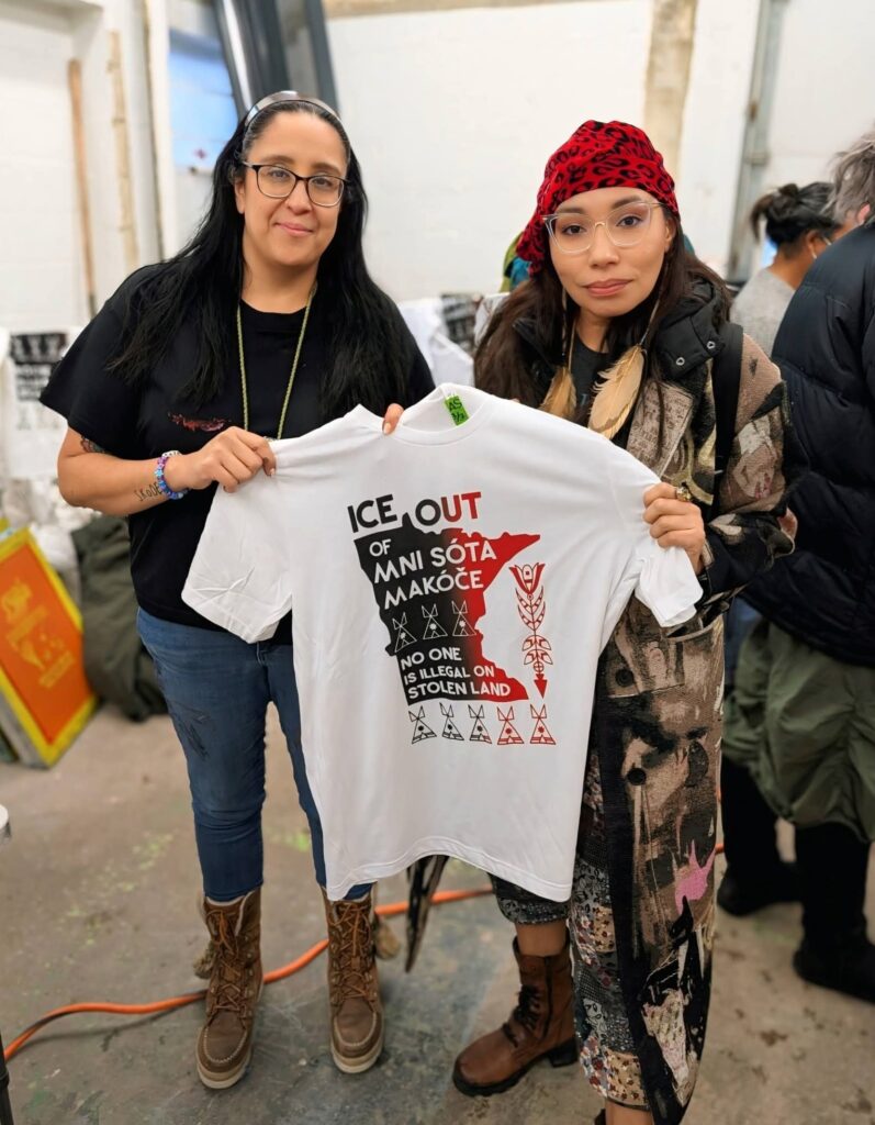 CC: I wanted a way to produce a lot of prints quickly, so screen printing just made sense. It’s fast, easily replicated, and accessible, which made it perfect for reaching the community. So far, myself and the amazing volunteers have done roughly 5,000 prints across community centers, schools, and organizations in Minneapolis and St. Paul. We had activities for families with small children while they waited in line, and an express line for elders. We printed on shirts, sweaters, pillowcases, ribbon skirts, and tote bags—and I even printed on a long piece of canvas that Alayna Eagle Shield turned into a traditional cradleboard. Throughout these pop ups we added a “We Are Power” design created by Marlena and one for the MMIR march.